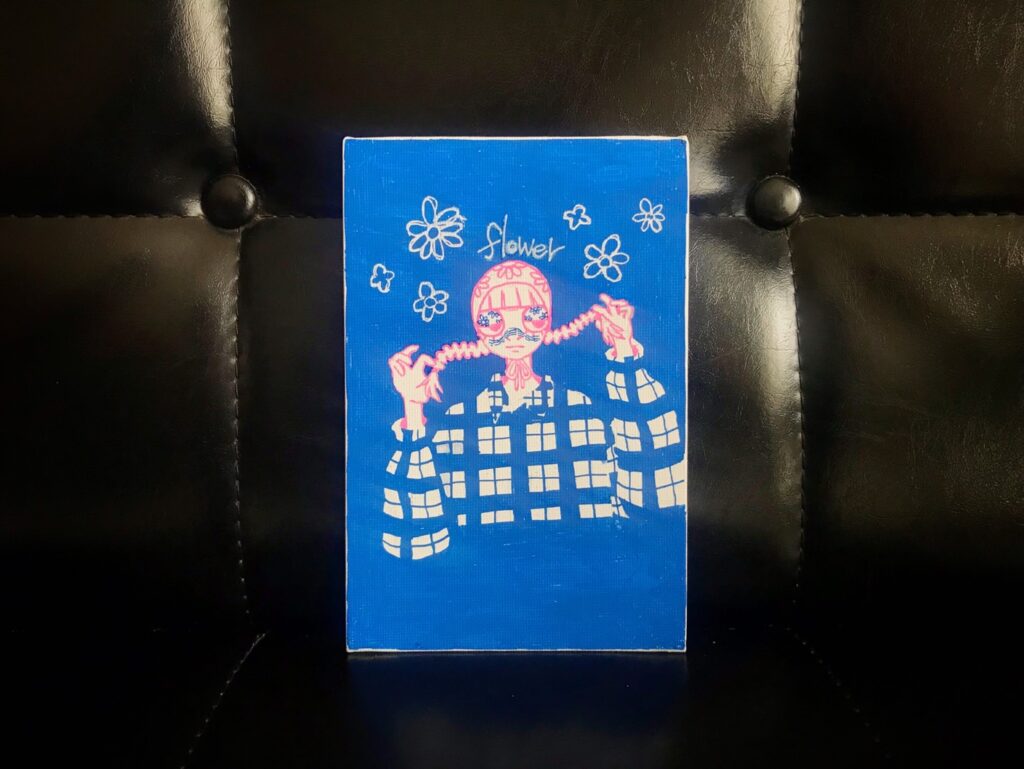 「flower」という言葉や周囲に散りばめられた花のモチーフが、全体に軽やかで夢見るような雰囲気を添えています。