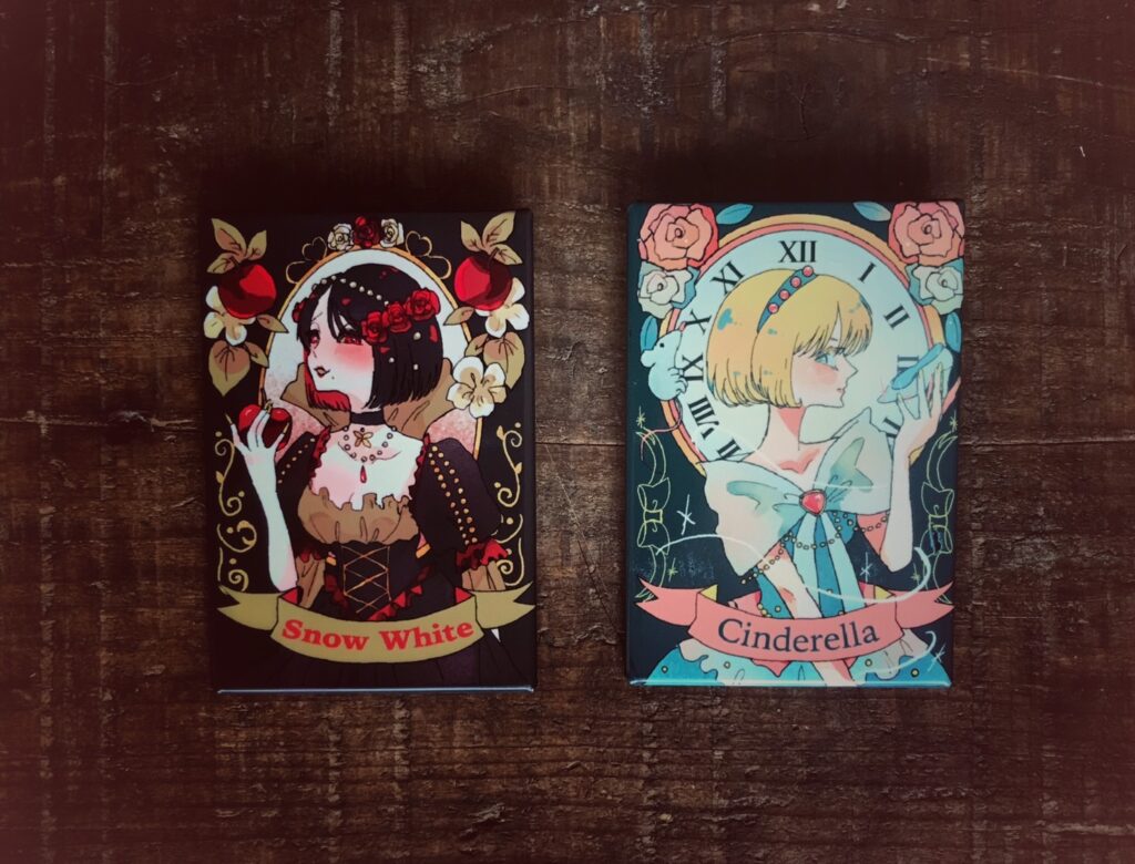 背景のモチーフも対照的で、白雪姫はリンゴやバラなど“誘惑と禁忌”を思わせるモチーフ、